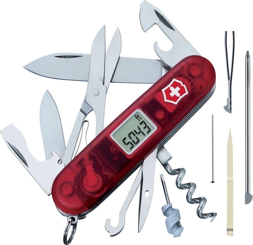 Con 25 usos disponibles. Longitud de 91 mm. Cachas mate traslúcidas. Hoja grande y pequeña. Sacacorchos. Abrelatas con destornillador 3 mm y 6 mm. Abrebotella. Desaislador de cables. Punzon escariador. Argolla. Pinza de depilar. Palillo de dientes. Tijera. Gancho multiuso. Lima para uñas. Bolígrafo. Alfiler (de acero inoxidable). Mini destornillador. Reloj digital 12/24 hs con despertador. Altimetro (mts/pies). Barómetro. Termometro (ºC/ºF).